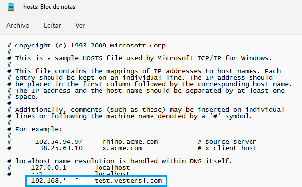 You should create a domain that points to the IP address of your atvise server. In our case, we create the domain test.vestersl.com. Only for test or demo purposes, instead of creating a domain, you might map a hostname to the IP address in the hosts file in your operating system. In Windows, it is located here: C:\Windows\System32\drivers\etc