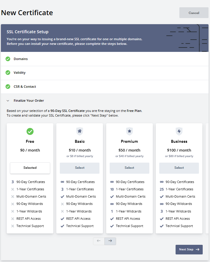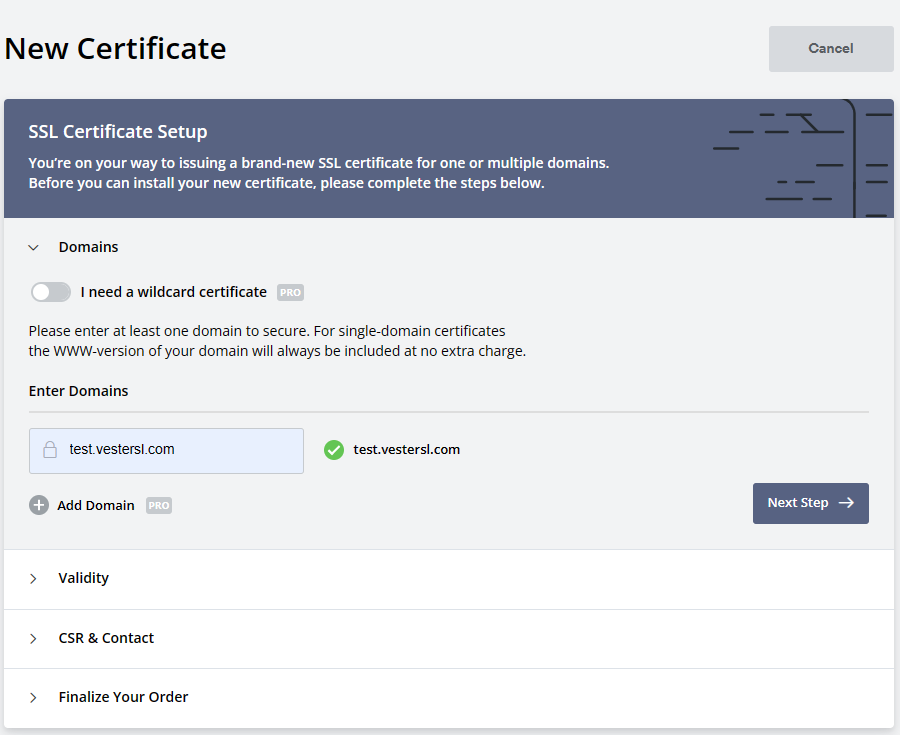 2.2 Create a New Certificate for your domain and then click on Next Step: