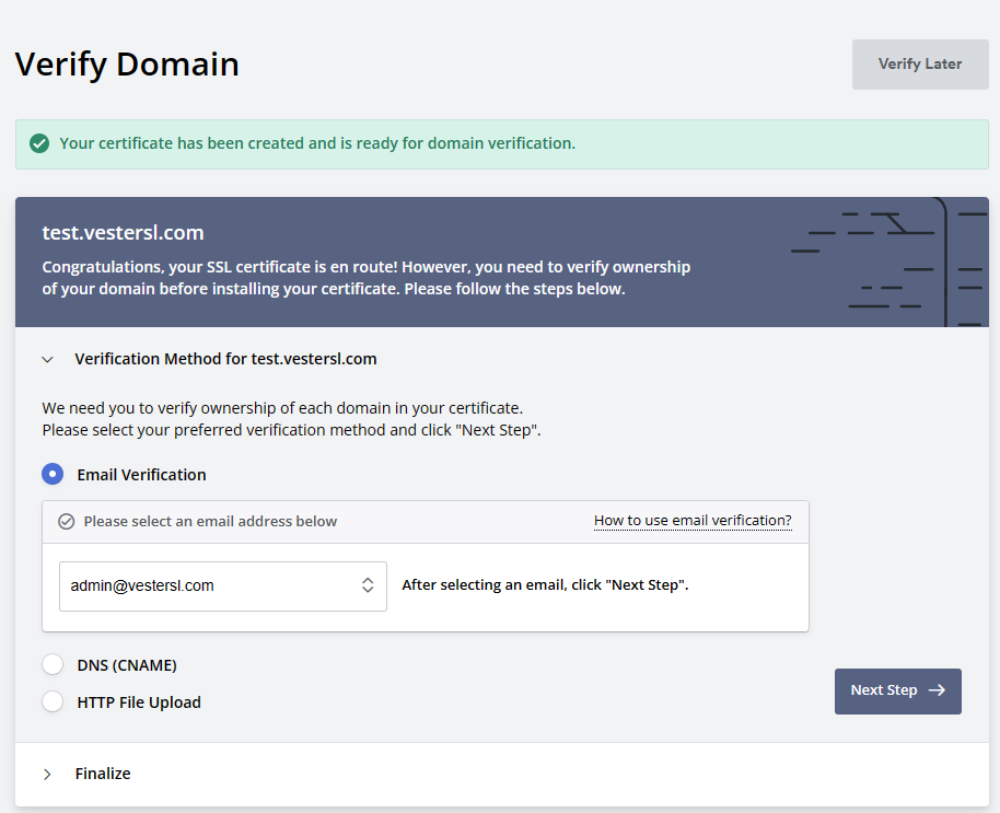 2.6 Validate your certificate using one of the 3 possible options: Email Verification, DNS (CNAME) or HTTP File Upload. In our case, we select Email Verification and select one of the proposed emails that we know that exists in our domain: