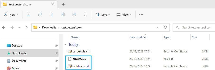 Now you have to use some Certification Authority that creates a valid SSL certificate for your domain. They should provide a certificate with the extension .crt, .der or .pem, and the private key with the extension .pem or .key. In our case, for test or demo purposes, we are using ZeroSSL Certification Authority: