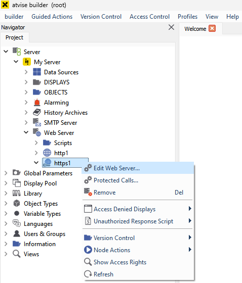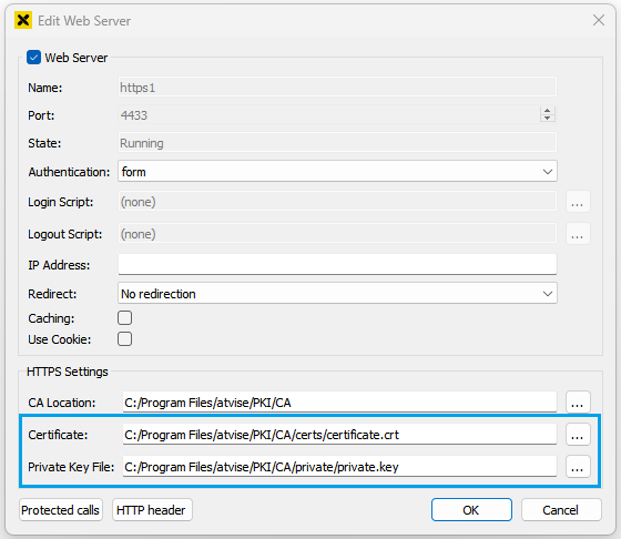 3.2 Open the atvise Builder and choose these files as the default certificate and key for the atvise HTTPs web server: