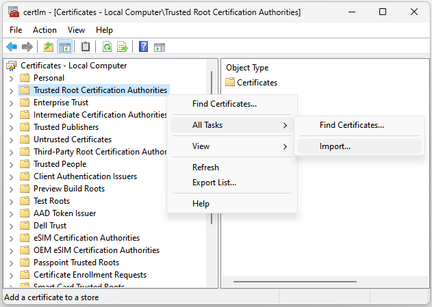 In our case, we are using Windows. Open the Microsoft Management Console, right click on Trusted Root Certification Authorities, All Tasks, Import... And follow the instructions to import our new certificate.crt: