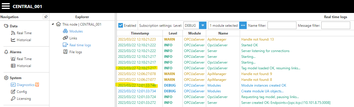 Then, if we set it to 0 so it's no has time limitation, the server starts normally. This is good to know because if we had a project with for example, like 20.000 tags, it will take more time than set up in default an will cause in module restart every minute making the server to never start.