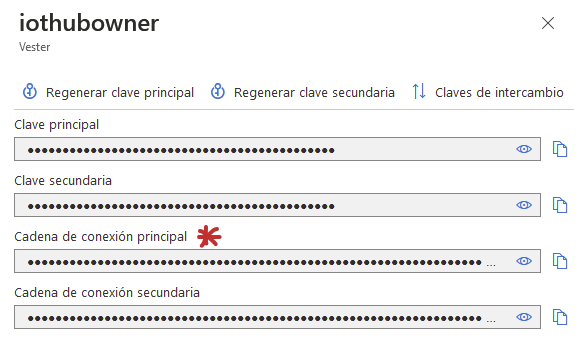 We enter the policy named "iothubowner" and copy the Primary Key connection string: