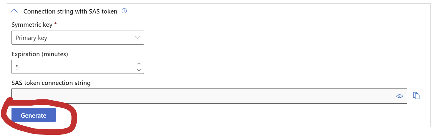 Once inside, it will show the enabled DEVICE_IDs. It's important to save this information. Access it and click on the option called "Connection string with SAS token". Specify using the Primary Key and set the expiration time to 60 minutes for testing, though this time is customizable as per your preference. Lastly, click on the "Generate" button to create the SAS Token. Copy the SAS Token and save it, as it will be used in vNode.