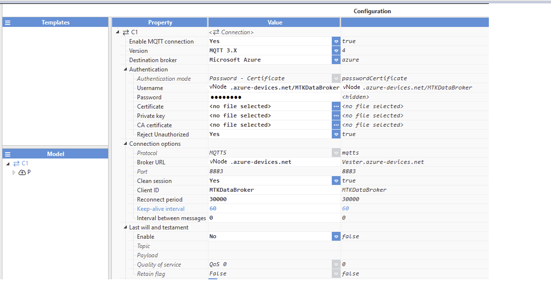 Username: This is composed of the hostname/device_id, found in Azure. Go to the IoT Hub, then to the Hostname section, and take the device_id name saved in the previous step.