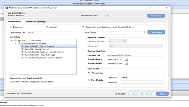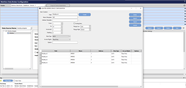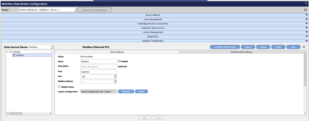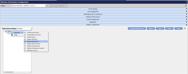 After that, we proceed to the Adapter Configuration option and create a new connection. We select our data source name and right-click to establish a connection via Modbus TCP/IP.
