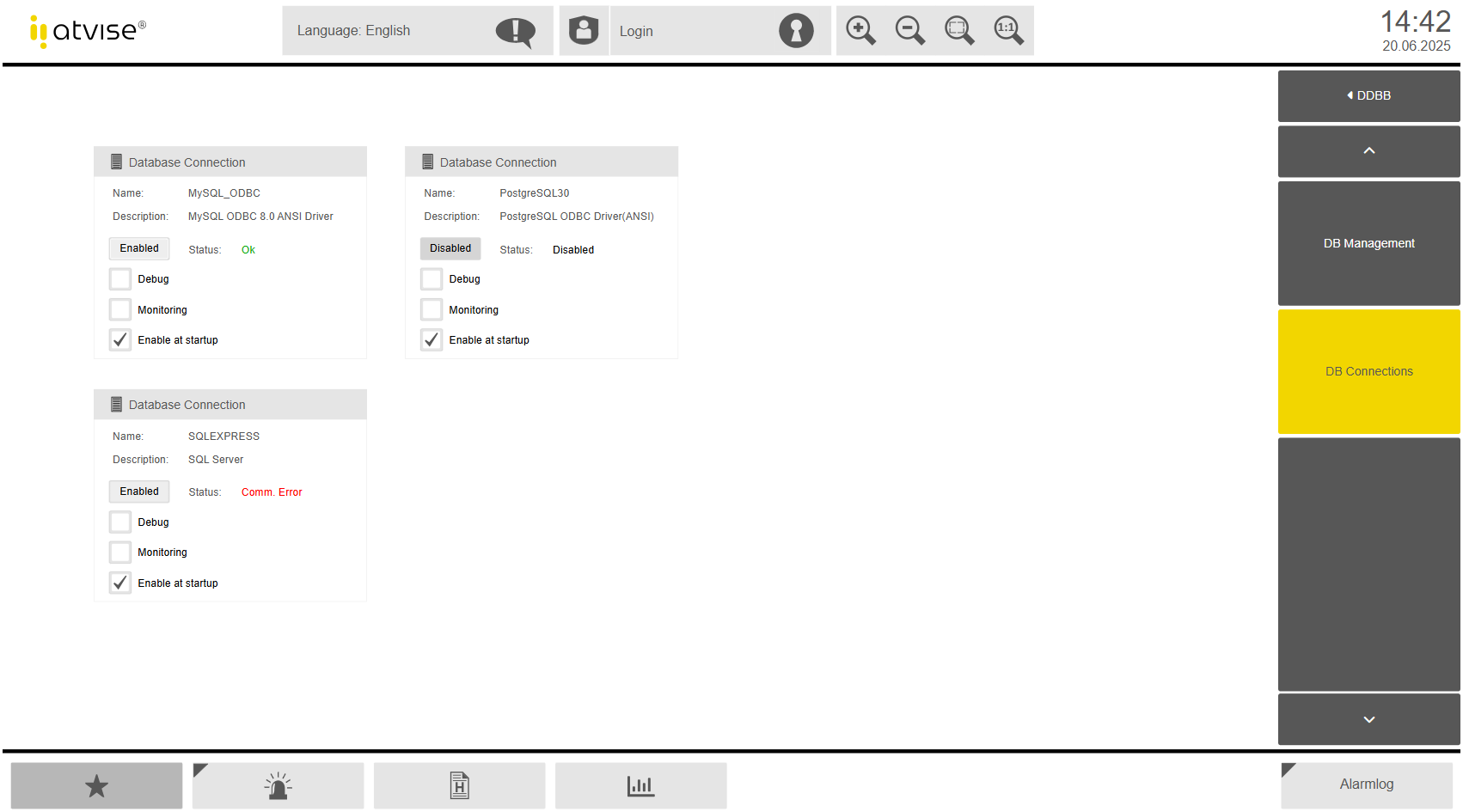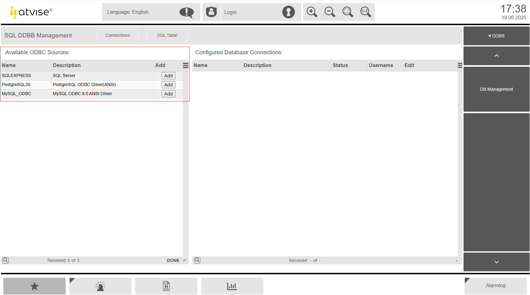 This manual explains how to use our Database Connections Library in your atvise projects. This library consists of a set of resources, displays, object types, scripts and global parameters that, after being imported into your atvise project, will allow you to connect atvise to any SQL database through ODBC, and use those connections to easily configure query scripts that run automatically in the background.