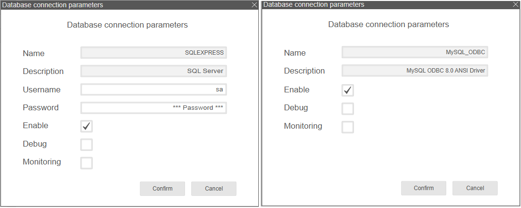 - Monitoring: Checkbox to activate/deactivate a watchdog that monitors the database connection status each 30 seconds. The monitoring function will automatically try to restore the connection if lost, otherwise it will be needed to disable and enable it manually.