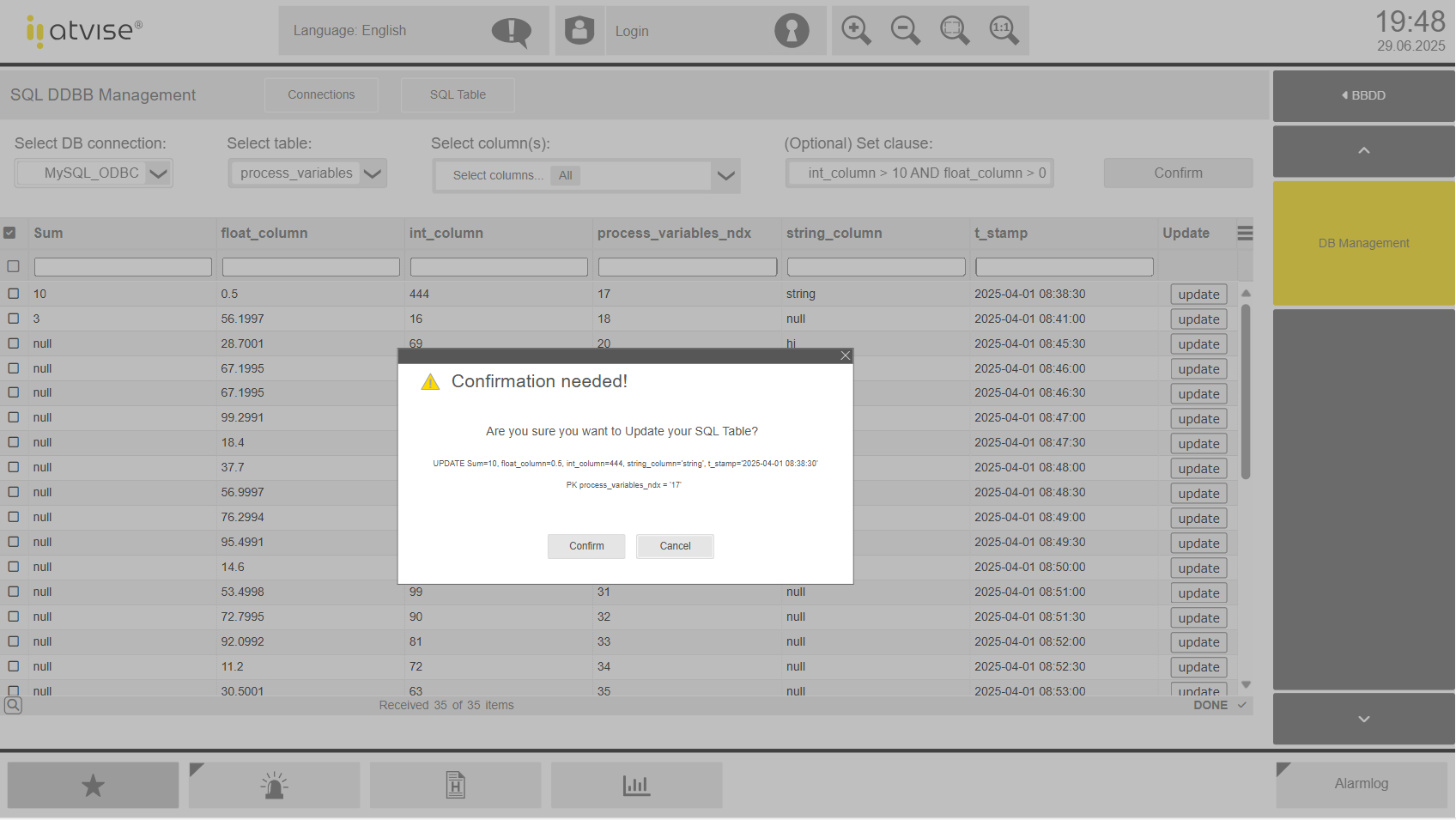 - By default, atvise does not modify the database structure. It does not automatically create tables, drop columns, or perform any structural changes. It is the developer’s responsibility to properly maintain the database and ensure it is compatible with the application.
