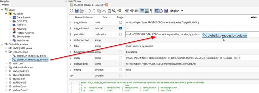 This script can be used to insert any number of atvise nodes as a block of rows with node name, value, status and timestamp into a database table. The nodes are read from a global list of the project and the database table has a structure like this: