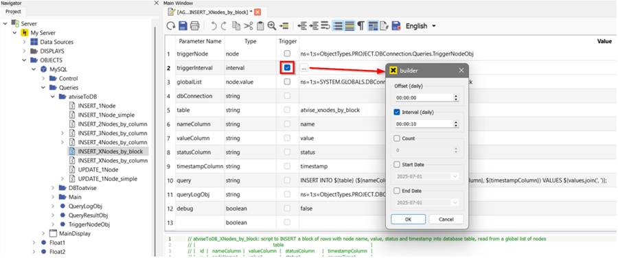 triggerInterval: interval time to trigger the query cyclically when not using a node value/status change (Example: Interval (daily) = 00:00:30)