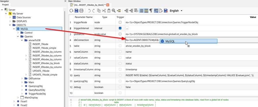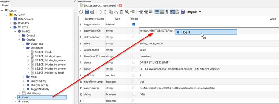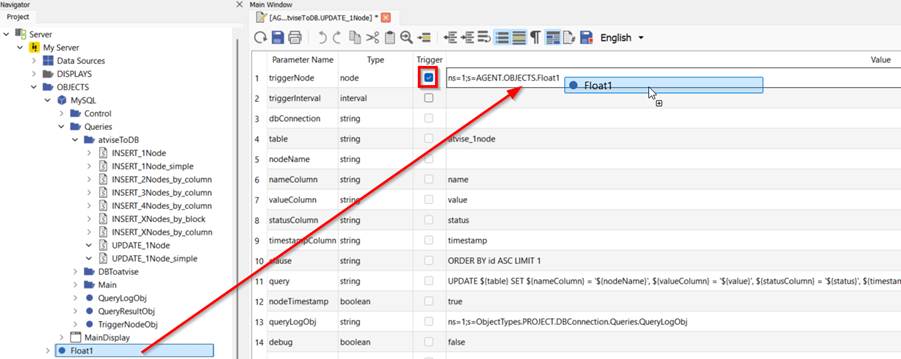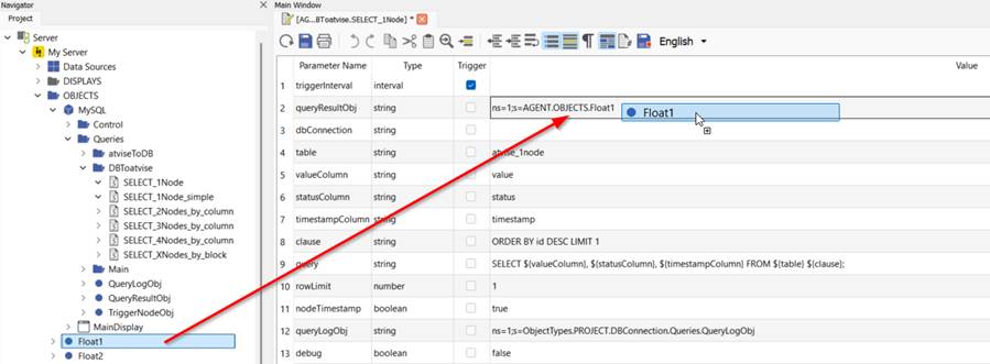 triggerNode: nodeId of the object that triggers the query by value/status change (Example: AGENT.OBJECTS.Float)